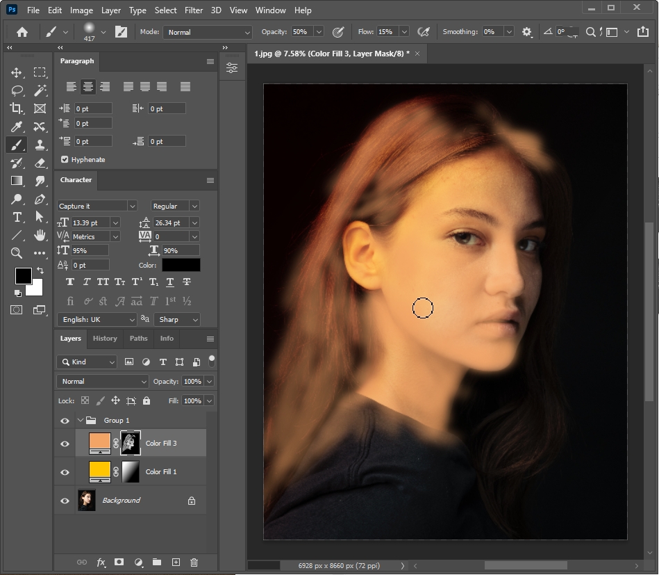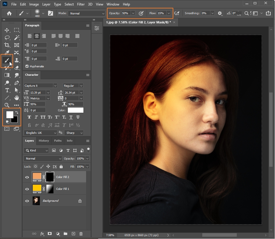 > Brush tool 선택 > Hardness : 0%, Opacity : 50%, Flow : 15%