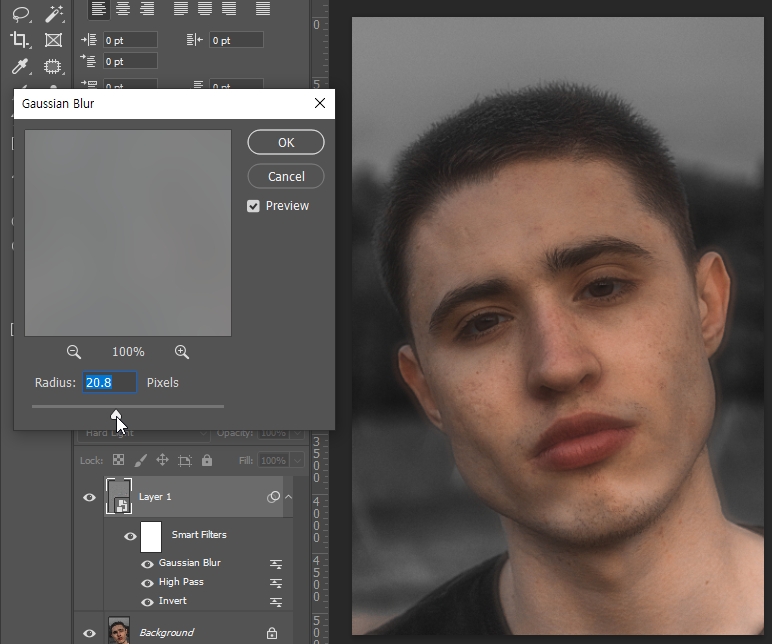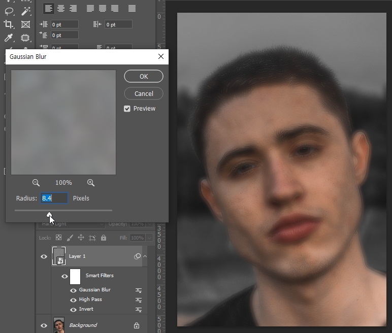 └ Gaussian Blur의 Radius(범위)의 숫자가 낮아질수록 Blur가 짙어지고 진한 잡티까지 모두 지워집니다.