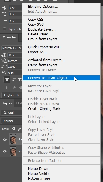 └ 복사된 Layer 파일 선택, 오른쪽 마우스 클릭 > Convert to Smart Object