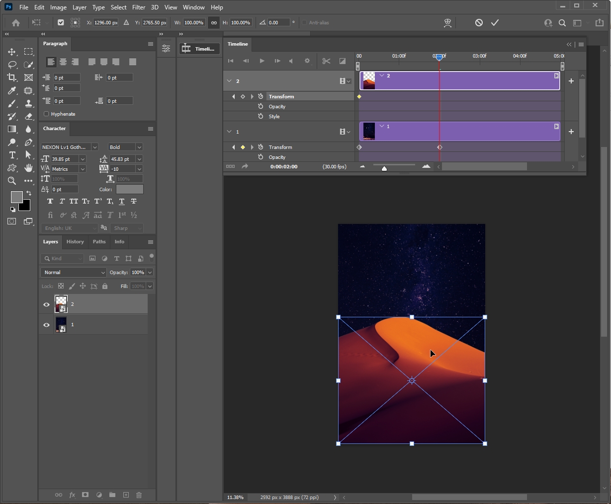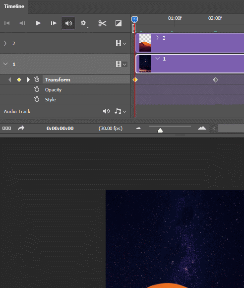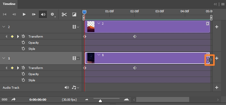 • 타임 바를 끝나는 지점에 맞추기 > 해당 Layer 선택 > 자유 변형 단축키 'Ctrl+T' > 사이즈 변형 > 끝점 생성