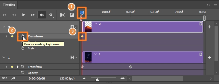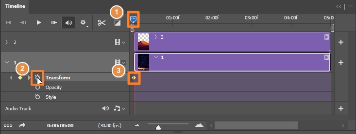 • 타임 바(①)를 시작하는 시점에 맞추기 > Transform 옆 아이콘(②) 클릭 > 시작점(③) 생성