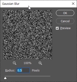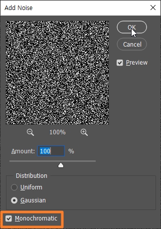 • Amount : 100% / Gaussian 선택 / Monochromatic 선택