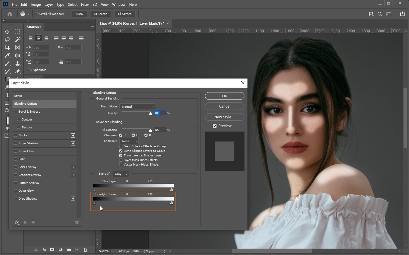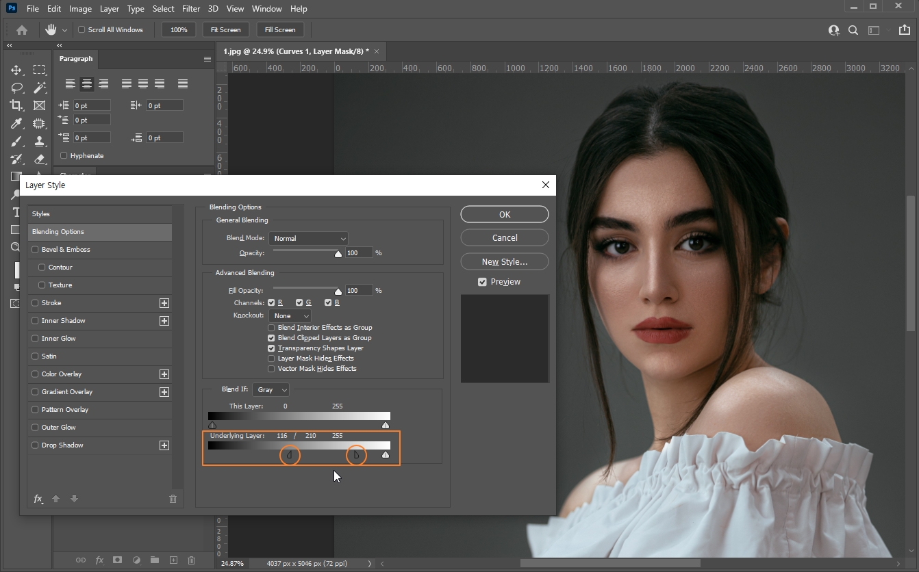 └ 하단 fx 아이콘 클릭 > Blending Options > Underlying Layer 바를 이용해 블렌딩