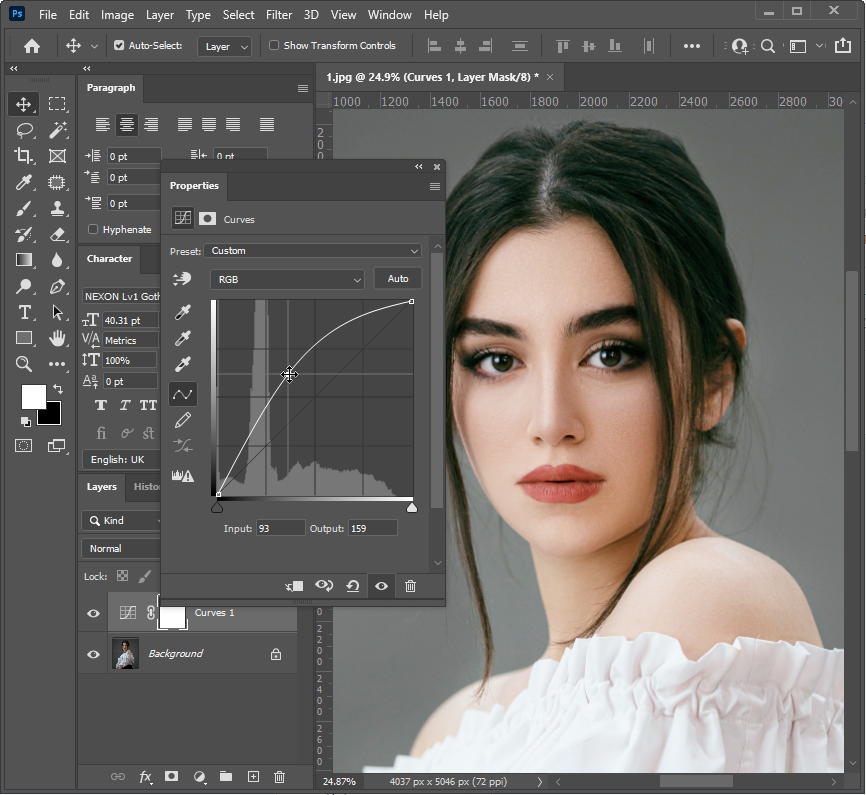 └ 하단 adjustment layer 아이콘 > Curves > 대각선 가운데를 왼쪽 대각선 위로 조절해 사진 밝기 조절