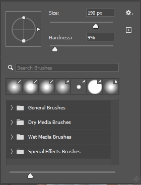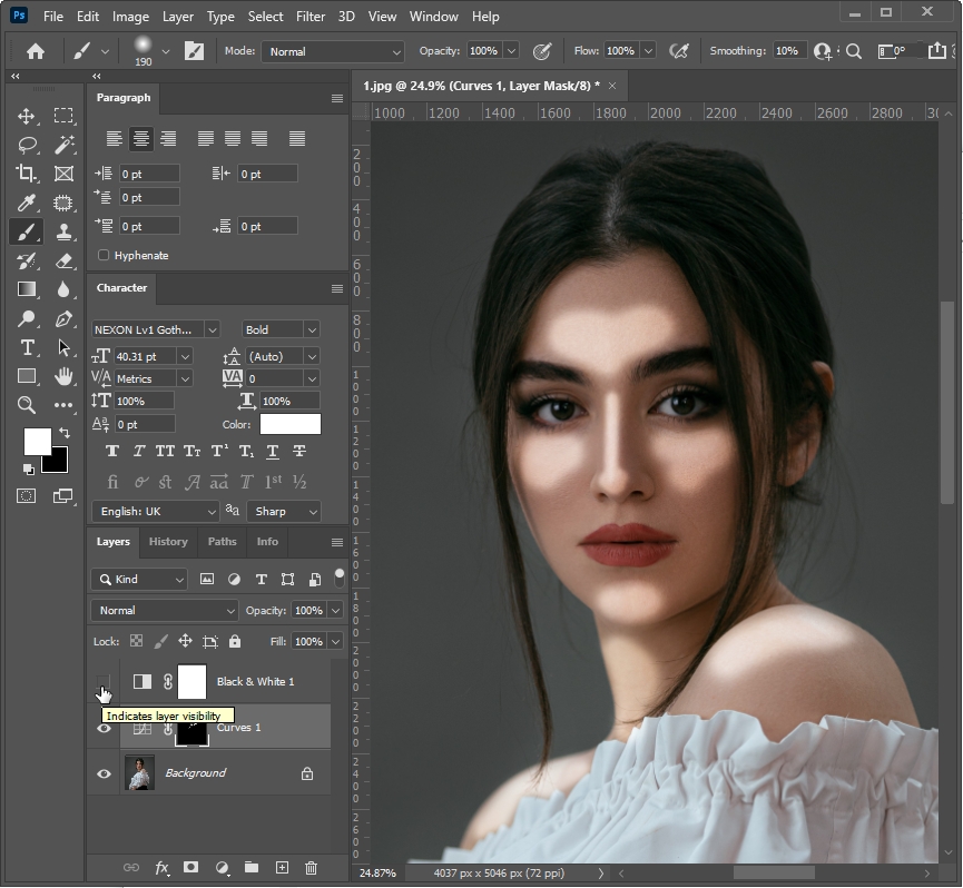 └ Curves의 Mask 선택 > 브러쉬툴 선택된 상태로 오른쪽 마우스 클릭 > Hardness 낮게 조절 > 빛을 주고 싶은 곳 위로 덧칠