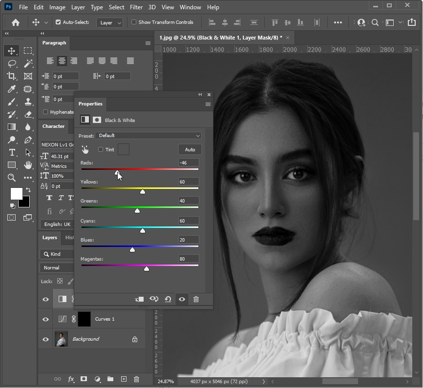 └ 하단 adjustment layer 아이콘 > Black & White > Reds만 색감 -40~-50