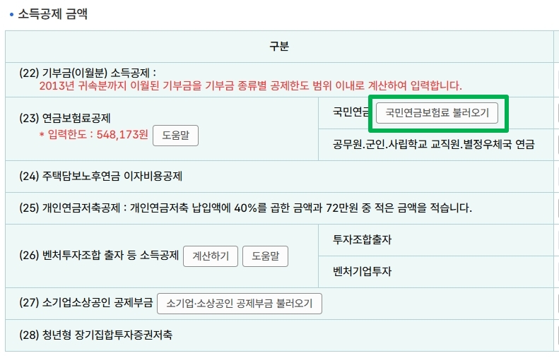 국민연금보험료는 불러오기를 통해 작성해 주세요.